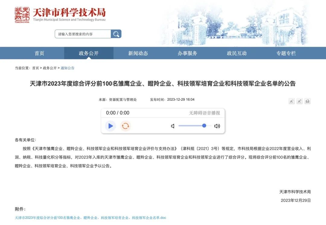近日,天津市科技局發布了《天津市2023年度綜合評分前100名雛鷹企業、瞪羚企業、科技領軍培育企業和科技領軍企業名單的公告》。