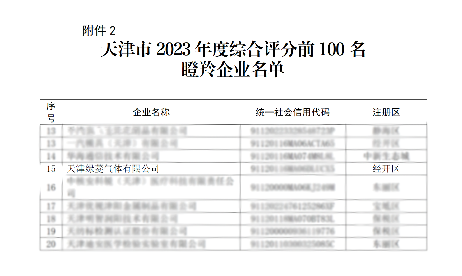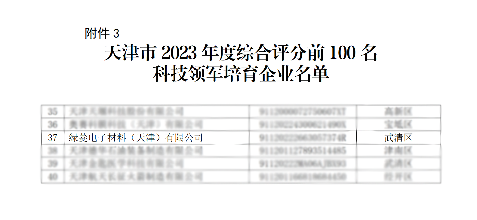綠菱氣體憑借強大的研發創新能力及優異的營收表現,天津綠菱、綠菱電子分別上榜“天津市2023年度綜合評分前100名瞪羚企業、科技領軍培育企業名單”,天津綠菱為瞪羚企業第15名,綠菱電子為科技領軍培育企業第37名。