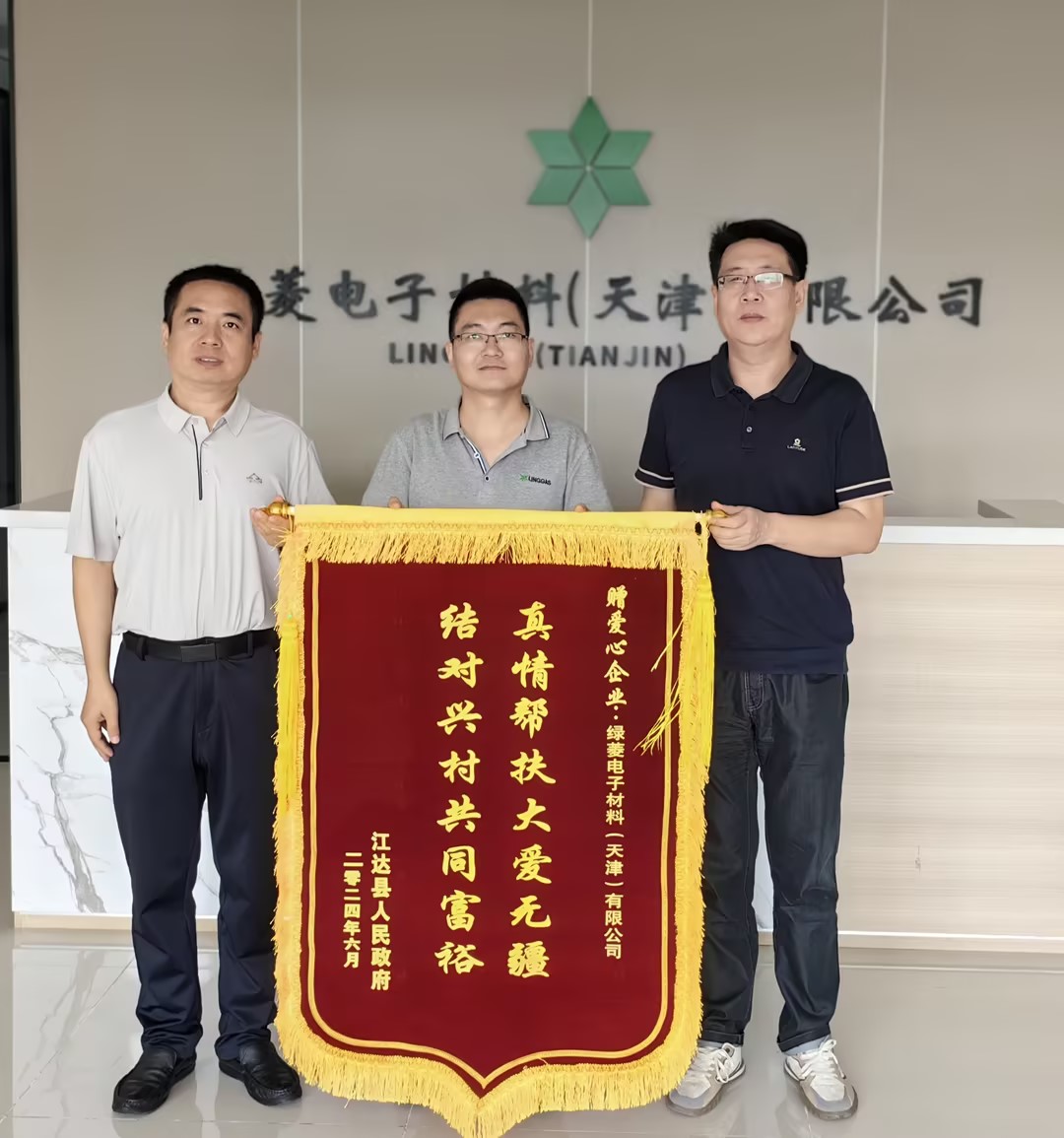 2024 年8月 6日,武清區河西務鎮副書記馬宇平、工會副主席丁曉東,陪同武清區工商聯同志一行專程來到綠菱氣體,為其送上一面錦旗,以感謝綠菱氣體公司在武清區對西藏江達縣定點幫扶項目中的杰出貢獻。